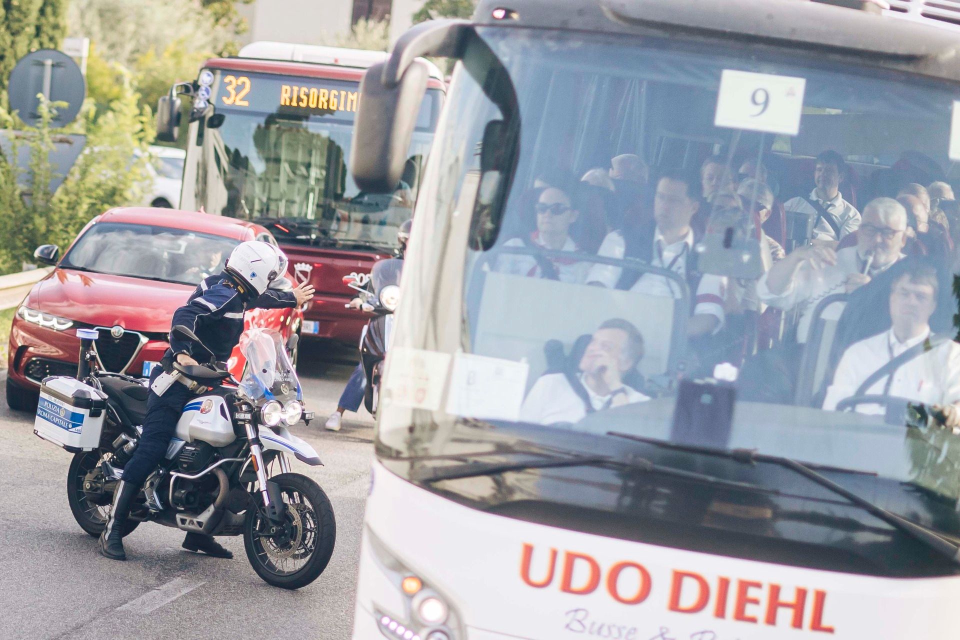 Was wäre die Malteser Romwallfahrt ohne die römische Motorradpolizei? Einfach unvorstellbar! Die akrobatischen Fahrmanöver vor und neben den Buskonvois, die Verkehrslenkung mit Trillerpfeife und das temperamentvolle Gestikulieren gehören einfach zu jeder Wallfahrt dazu.
