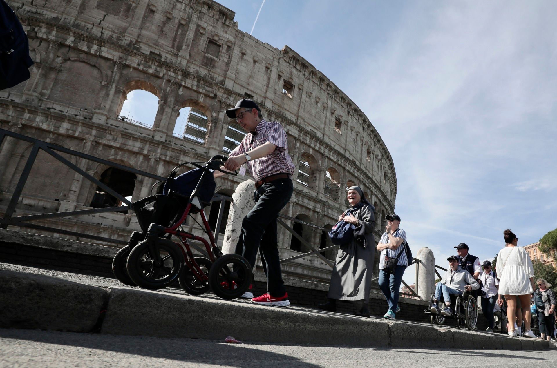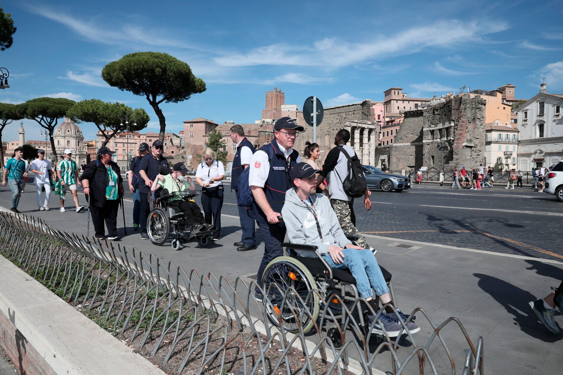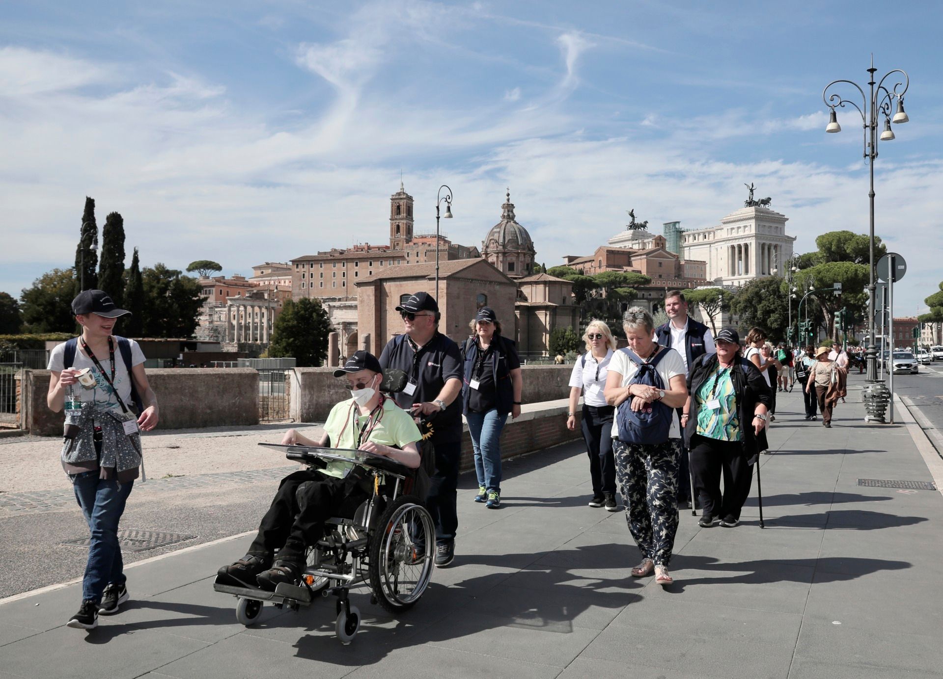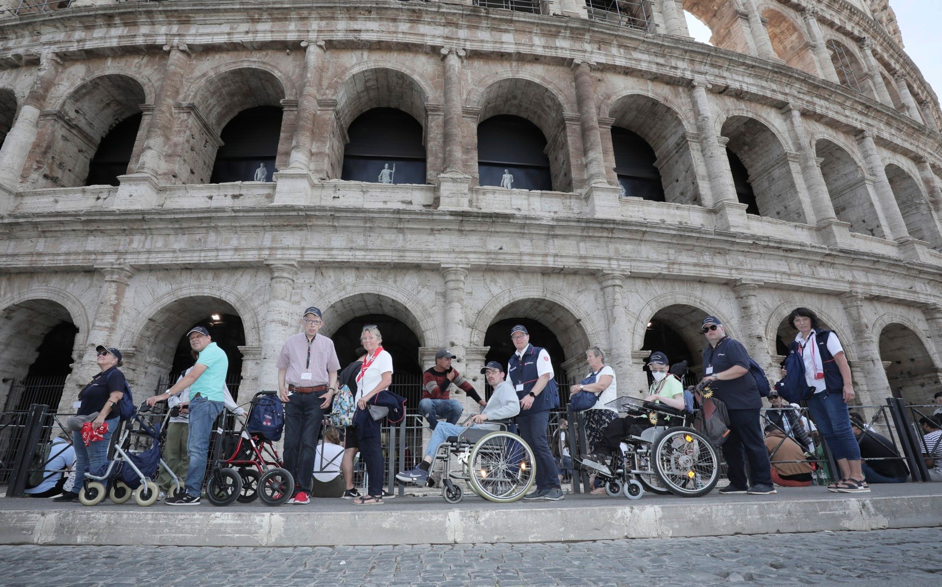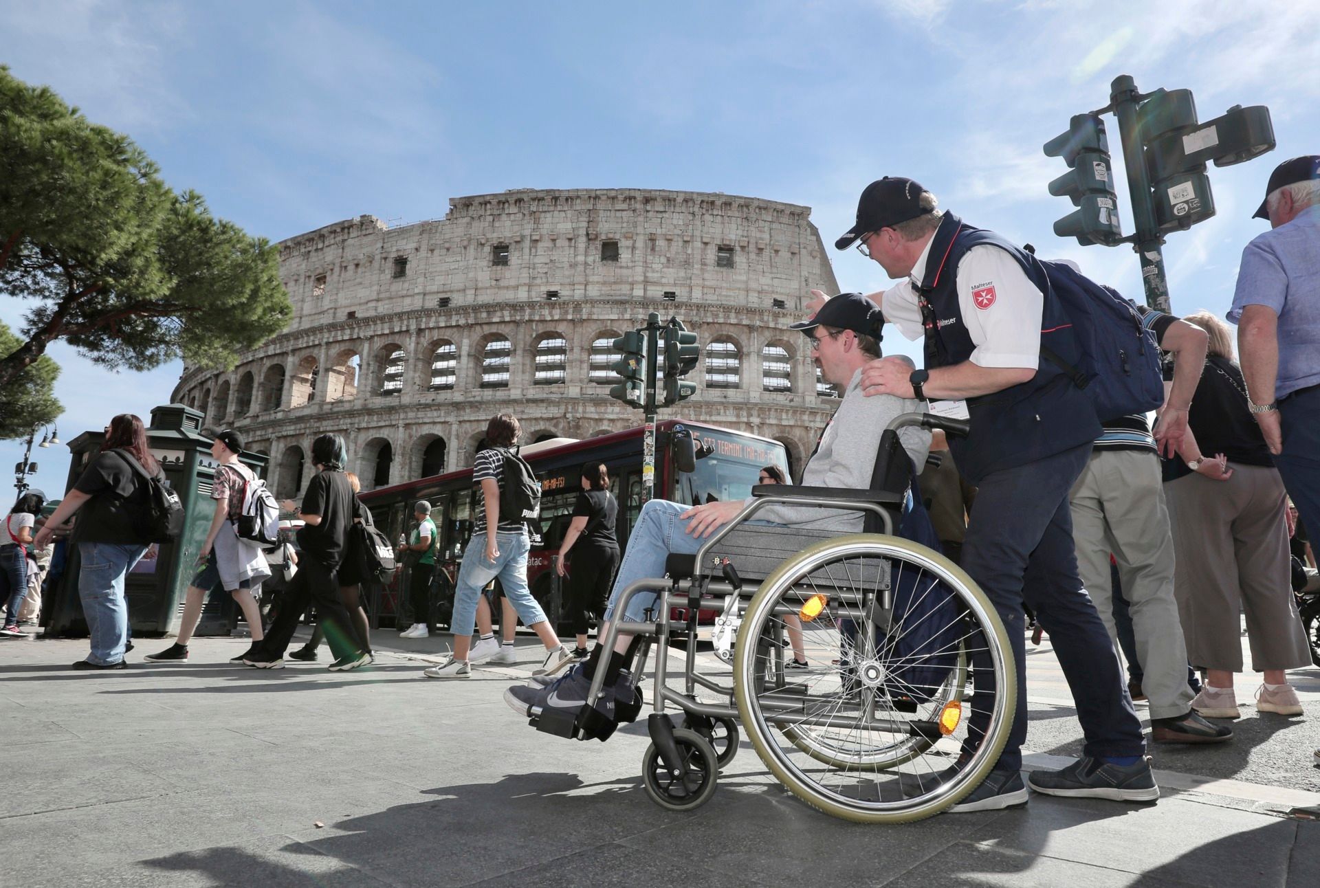 Am fünften Tag erobern die meisten Pilger-Gruppen zu Fuß und auf vier Rollstuhl-Rädern das historische Stadtzentrum Roms, während es andere bei dem schönen Wetter an den Strand bei Ostia zieht.
