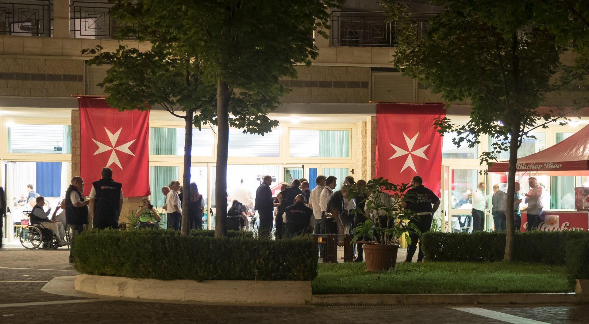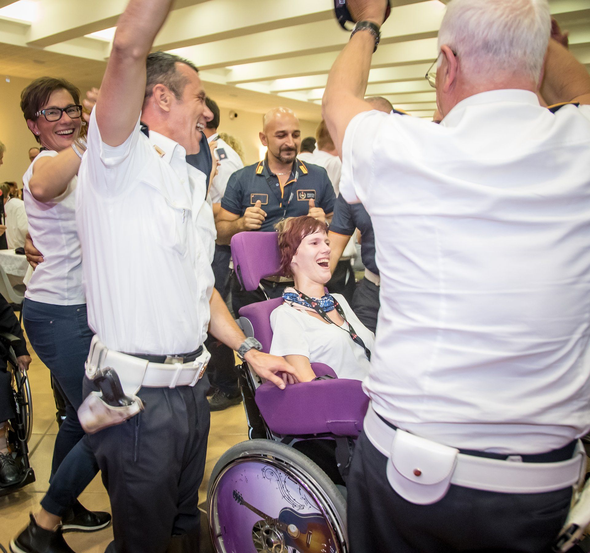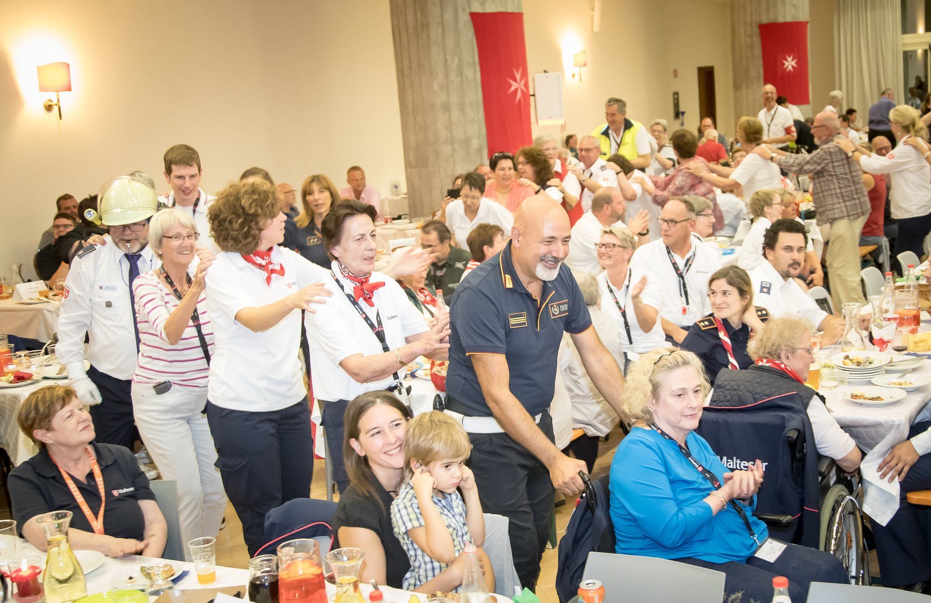 Fleißige Helfer des Service-Teams des Fraterna Domus und der Malteser verwandeln an diesem Abend einen großen Konferenzraum in einen echten Festsaal. Das wunderbare Essensbuffet und gute Musik sorgen für ausgelassene, fröhliche Stimmung unter den Pilgern, auch wenn es schon morgen heißt, Abschied zu nehmen. Nach den richtigen Dankesworten der Wallfahrtsleitung, dem tosenden Applaus für unsere tollen römischen Motorrad-Polizisten, tanzen die Rollstühle noch bis tief in die Nacht.