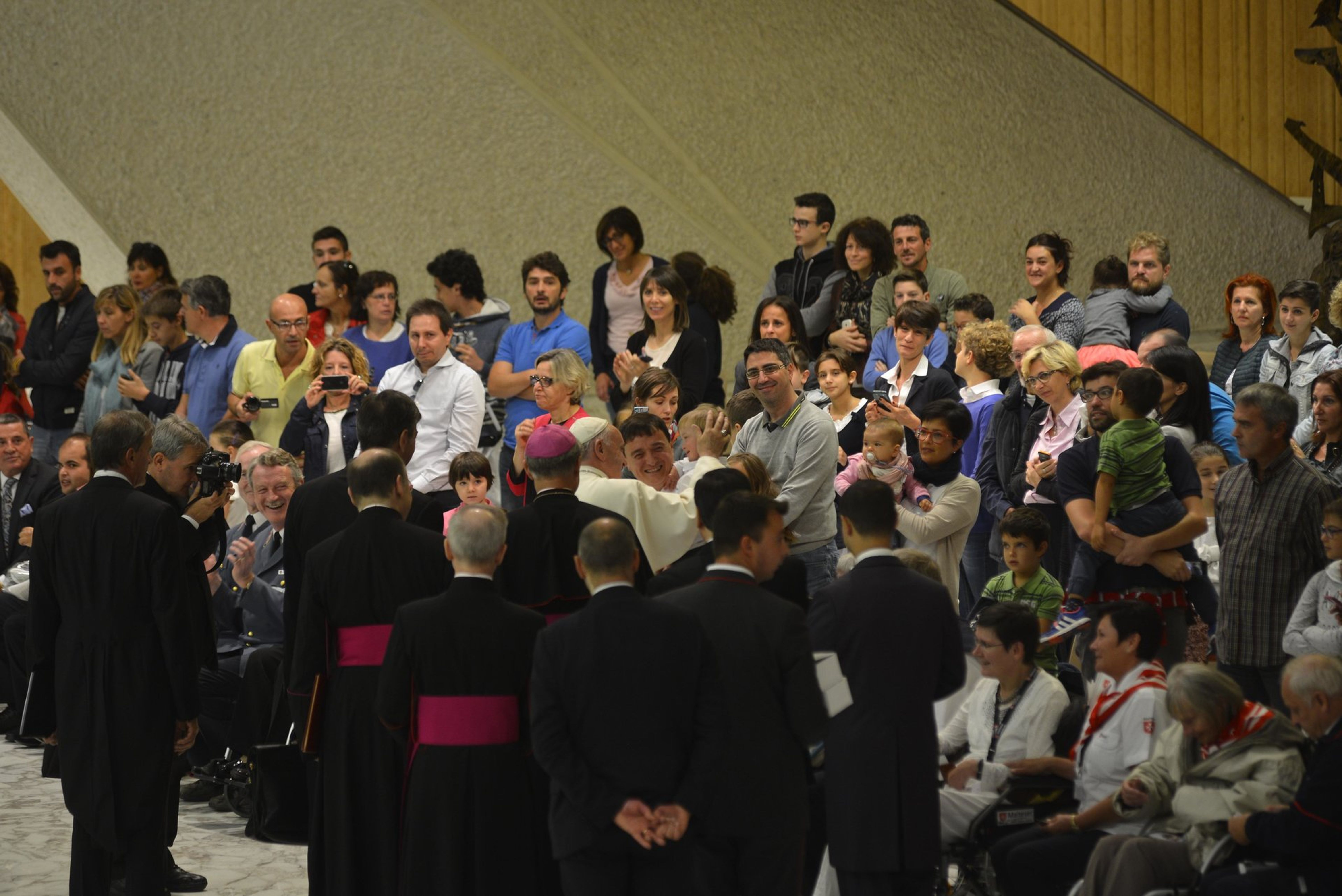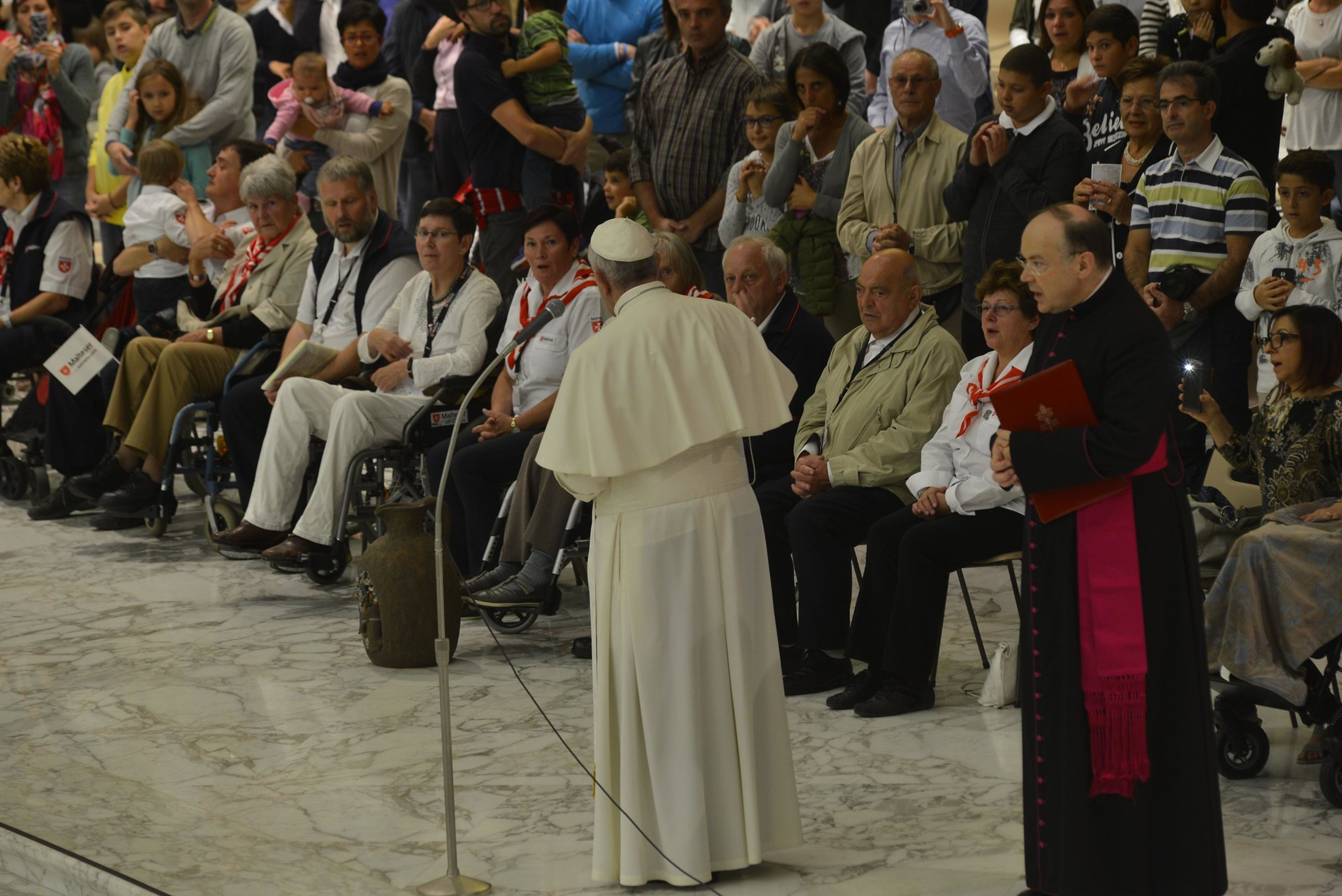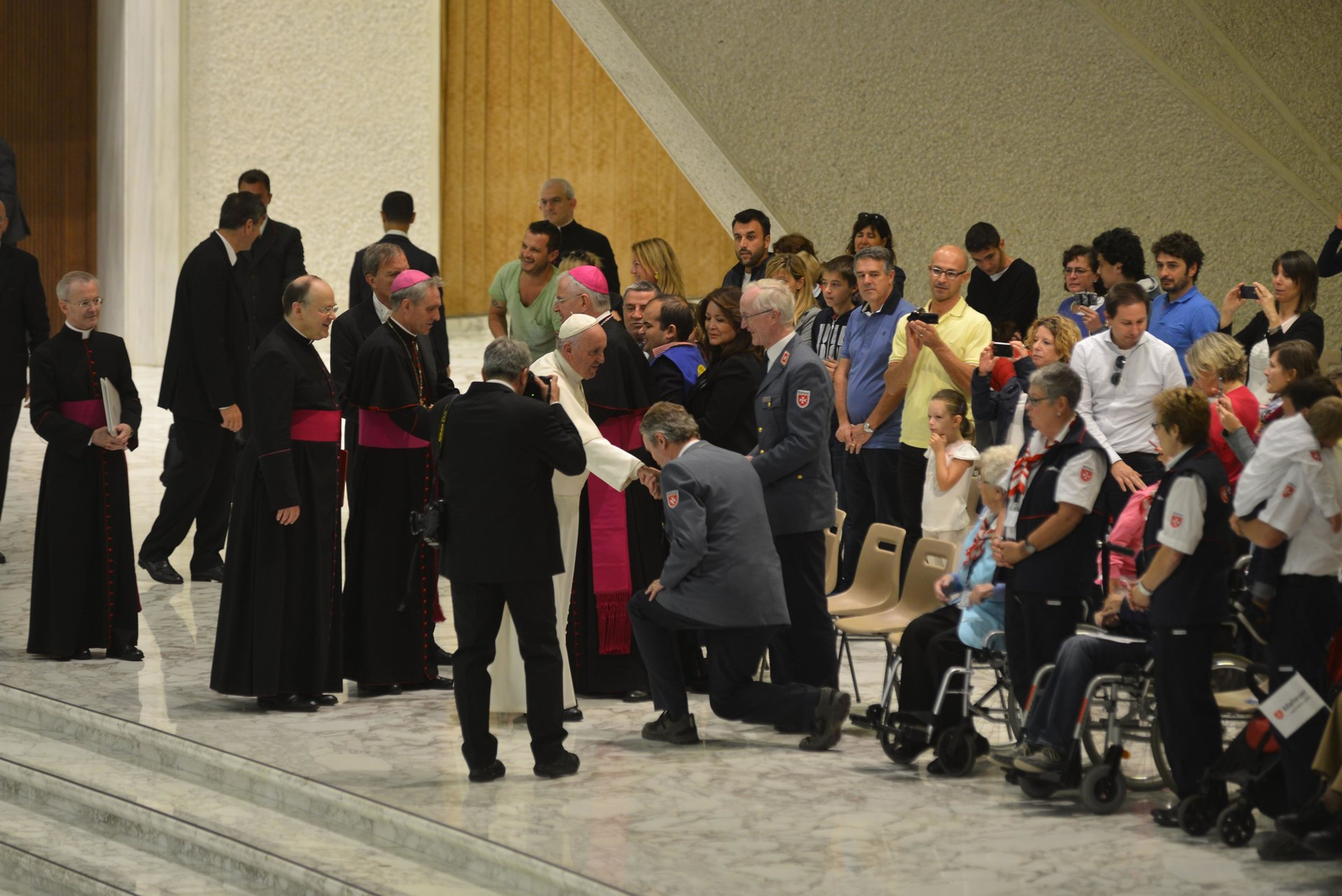 Überraschung: Die malteser Pilger empfängt Papst Franziskus nicht in der Generalaudienz auf dem Petersplatz, sondern zuvor in der von ihnen nur zu einem Drittel gefüllten Audienzhalle. So ist er den maltesern viel näher als erwartet. Einige begrüßt er persönlich und nimmt beispielsweise die dreijährige Käthe Rosner, die mit dem Down-Syndrom zur Welt kam, in den Arm.