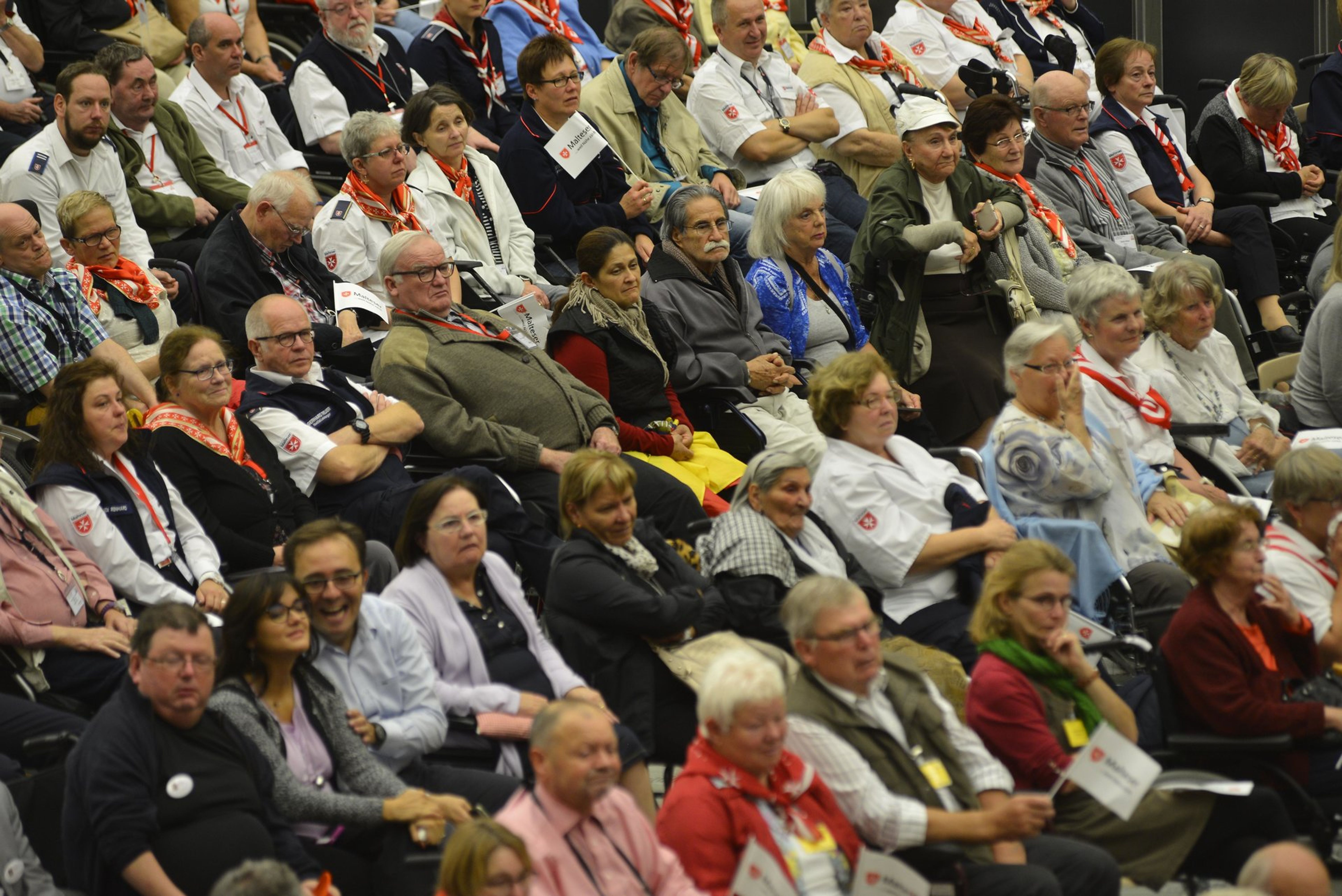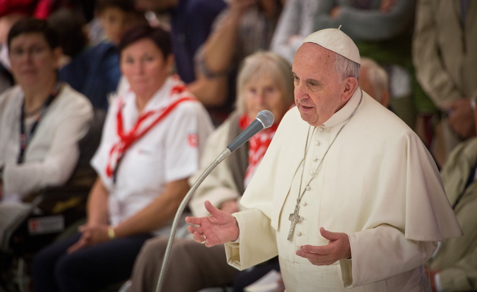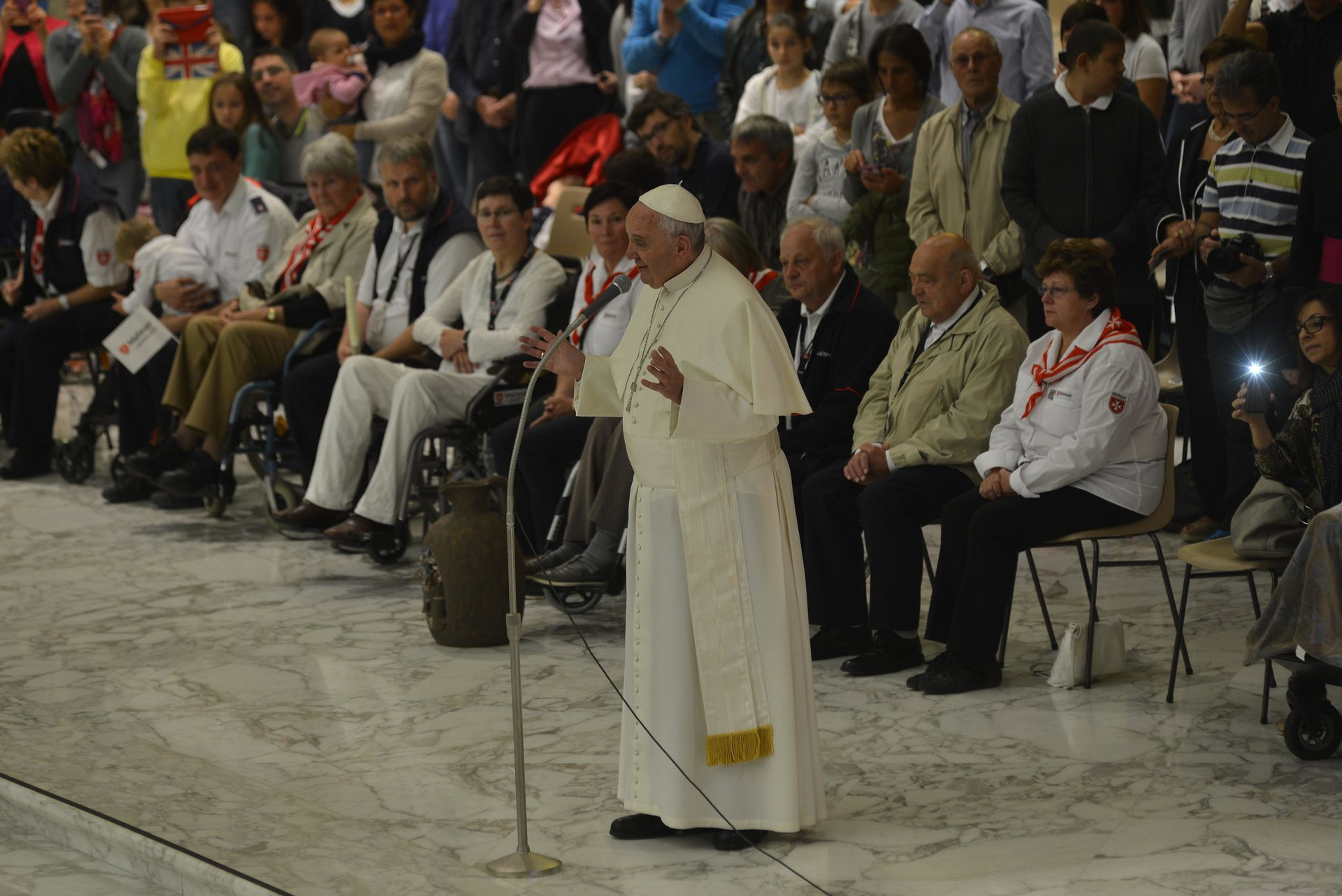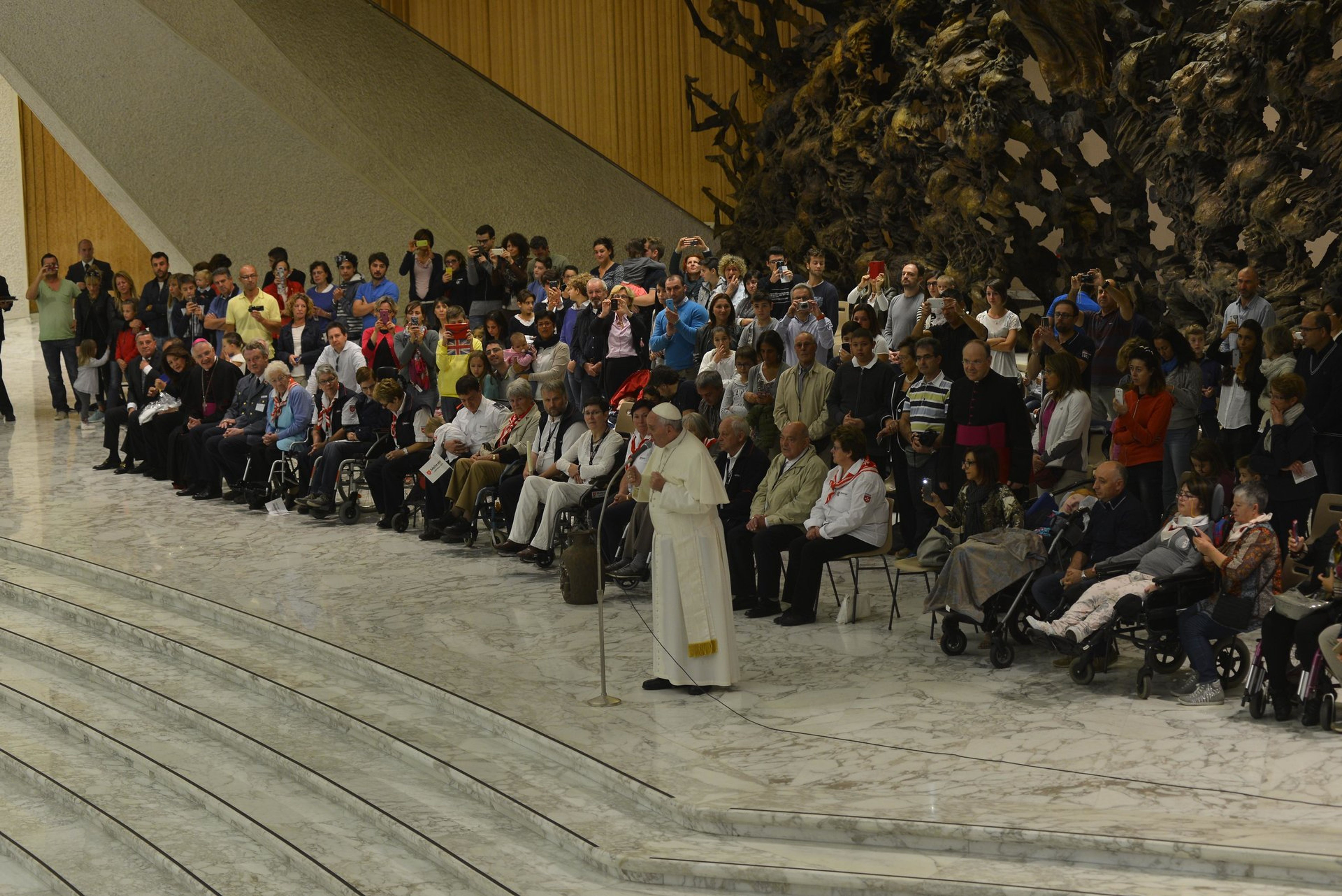 Überraschung: Die malteser Pilger empfängt Papst Franziskus nicht in der Generalaudienz auf dem Petersplatz, sondern zuvor in der von ihnen nur zu einem Drittel gefüllten Audienzhalle. So ist er den maltesern viel näher als erwartet. Einige begrüßt er persönlich und nimmt beispielsweise die dreijährige Käthe Rosner, die mit dem Down-Syndrom zur Welt kam, in den Arm.