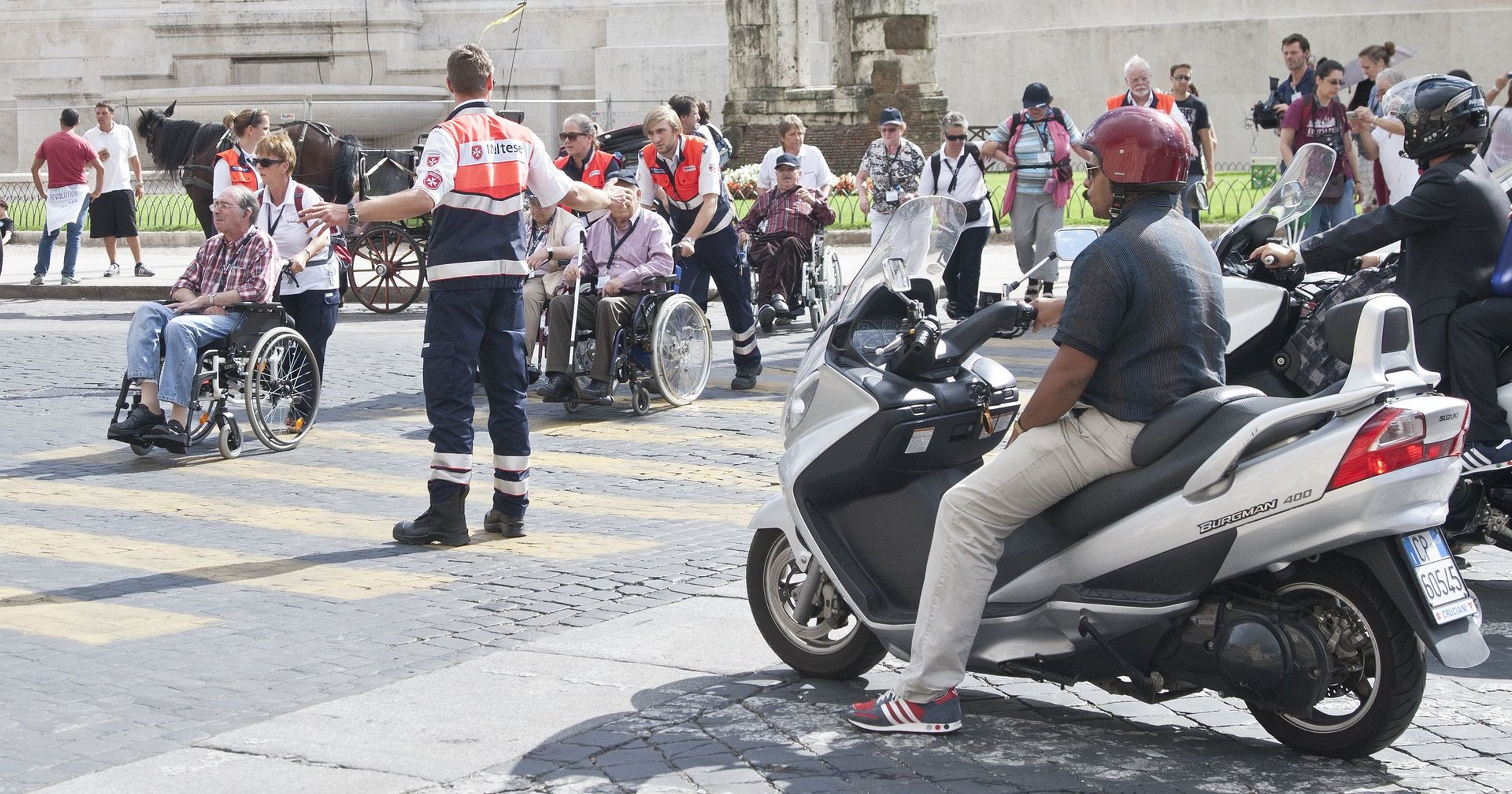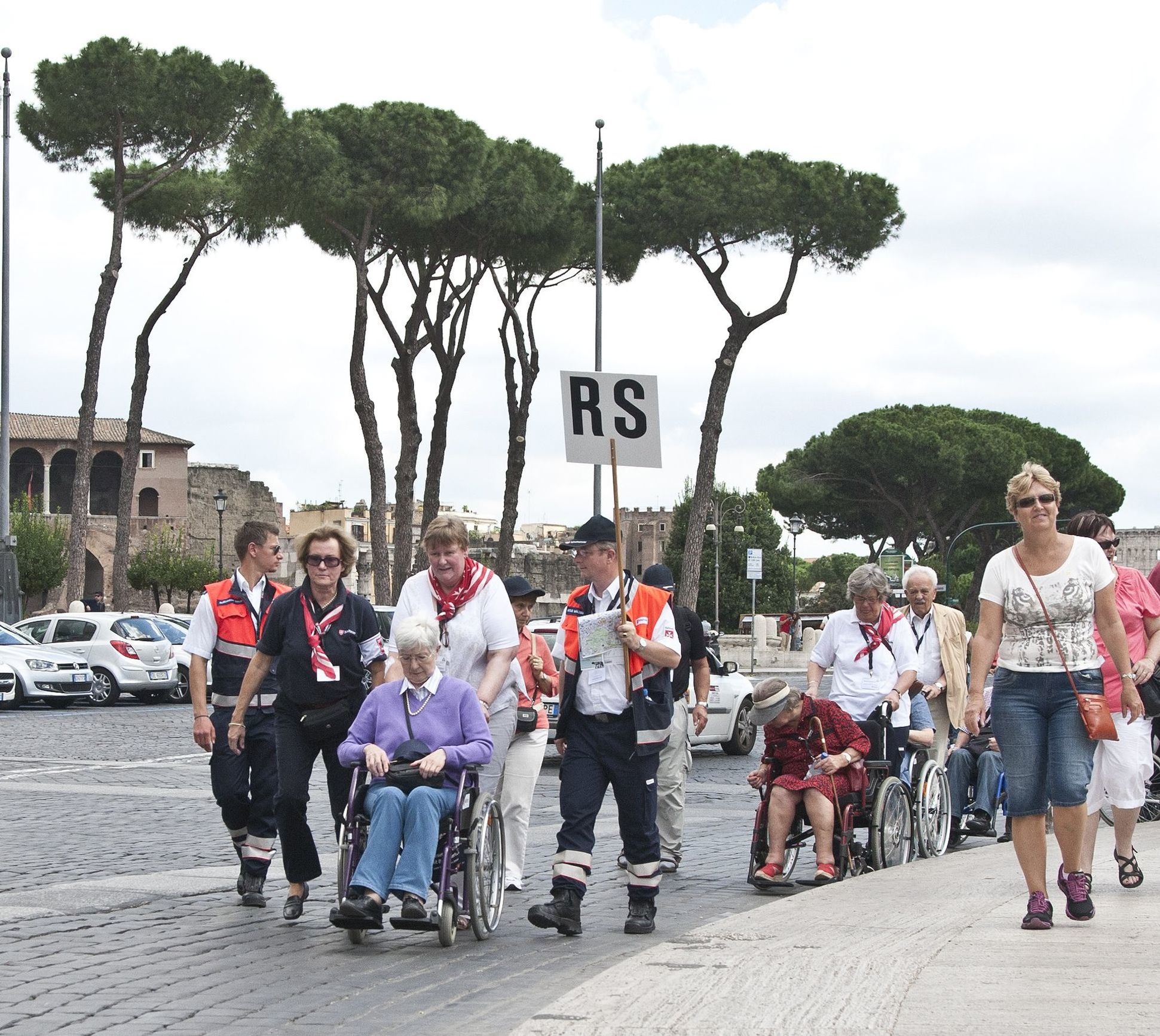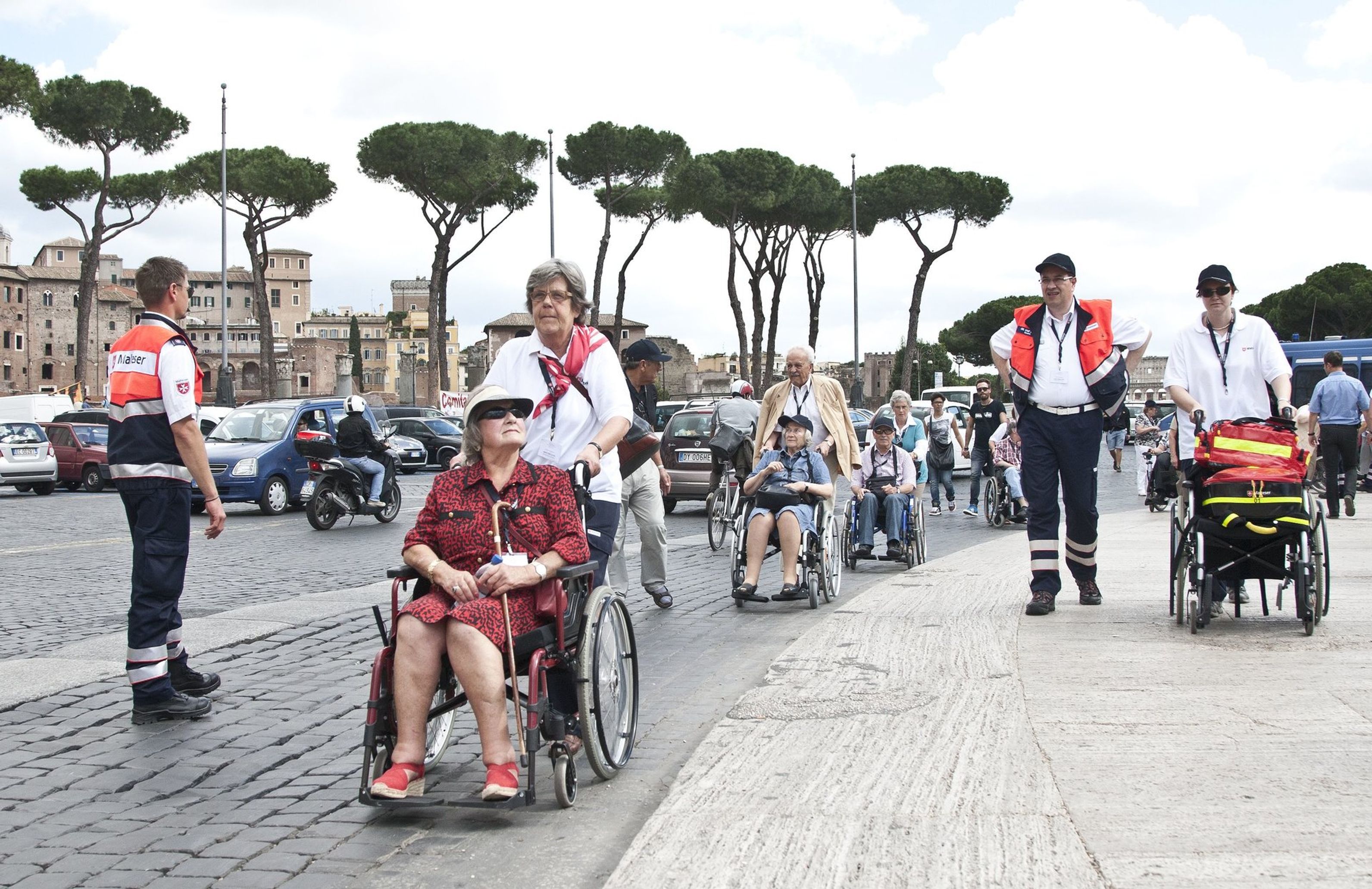 Geleitet von der römischen Motorradpolizei schwärmten die deutschen Pilger zu Fuß, mit Rollstuhl und Rollator zu den Sehenswürdigkeiten der Ewigen Stadt aus. Und wieder zeigte sich: So lebhaft und temperamentvoll es im römischen Verkehr sonst auch zugeht, wollte eine der Rolli-Gruppen über die Straße, wurden die heimischen Motorrad- und Autofahrer vorsichtig und rücksichtsvoll.