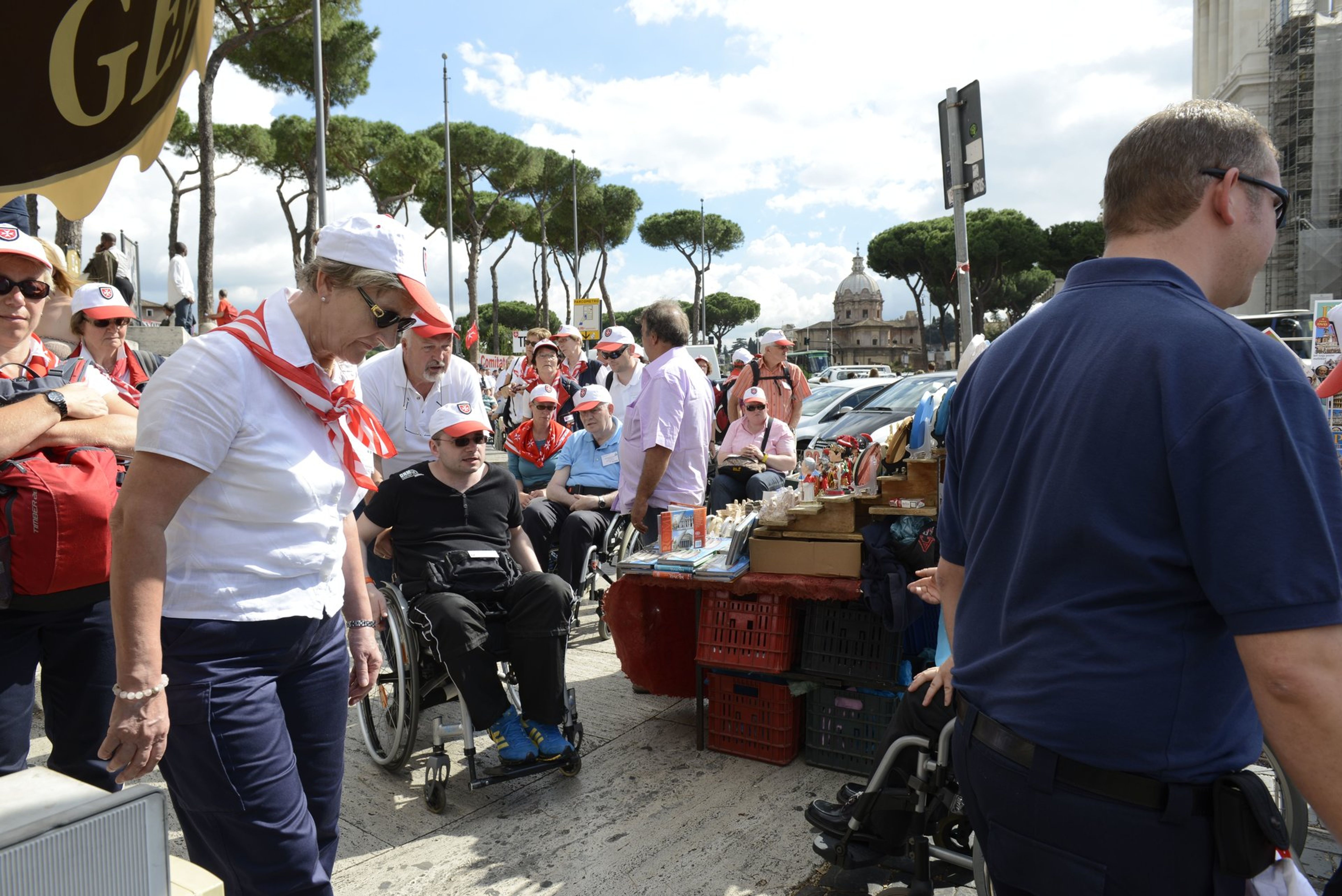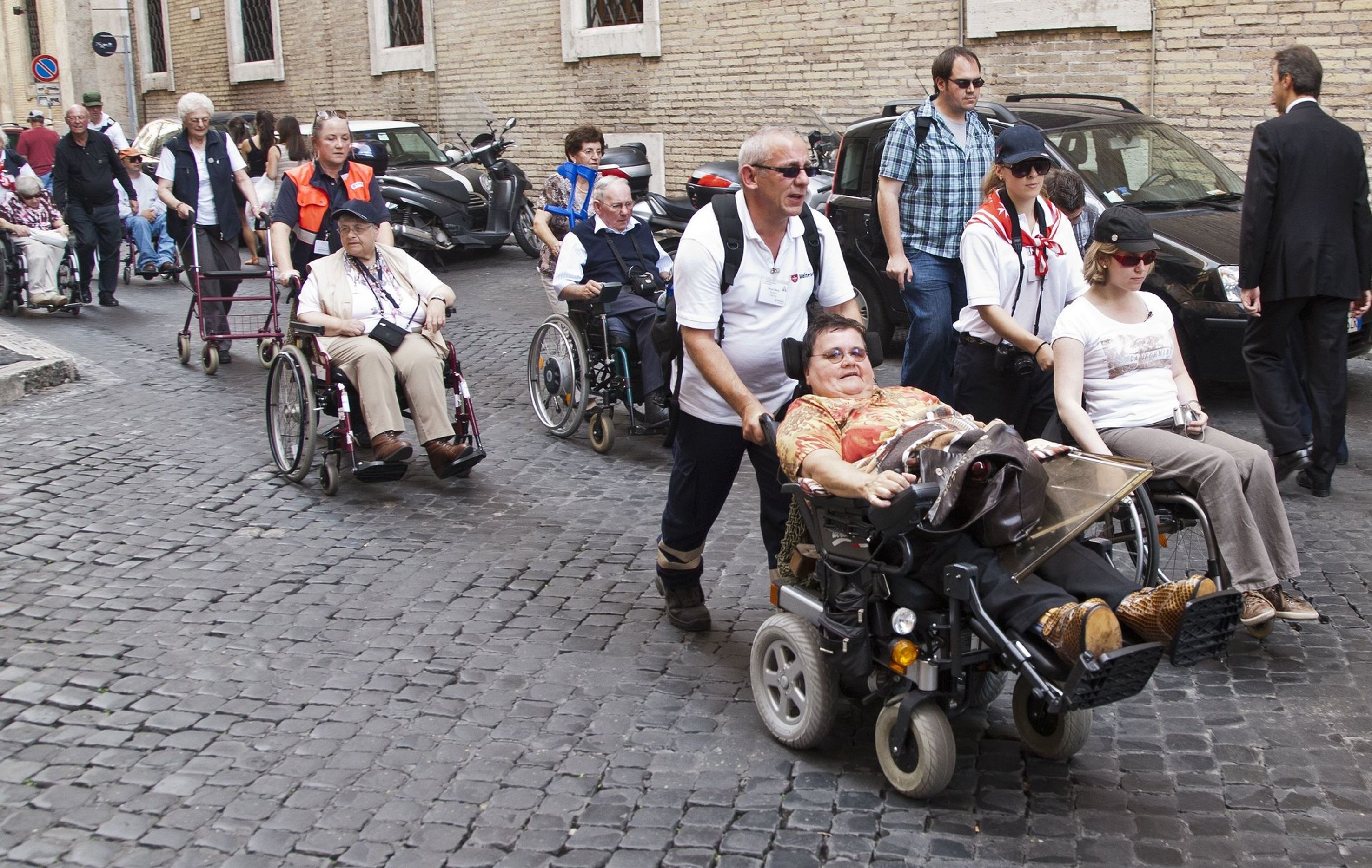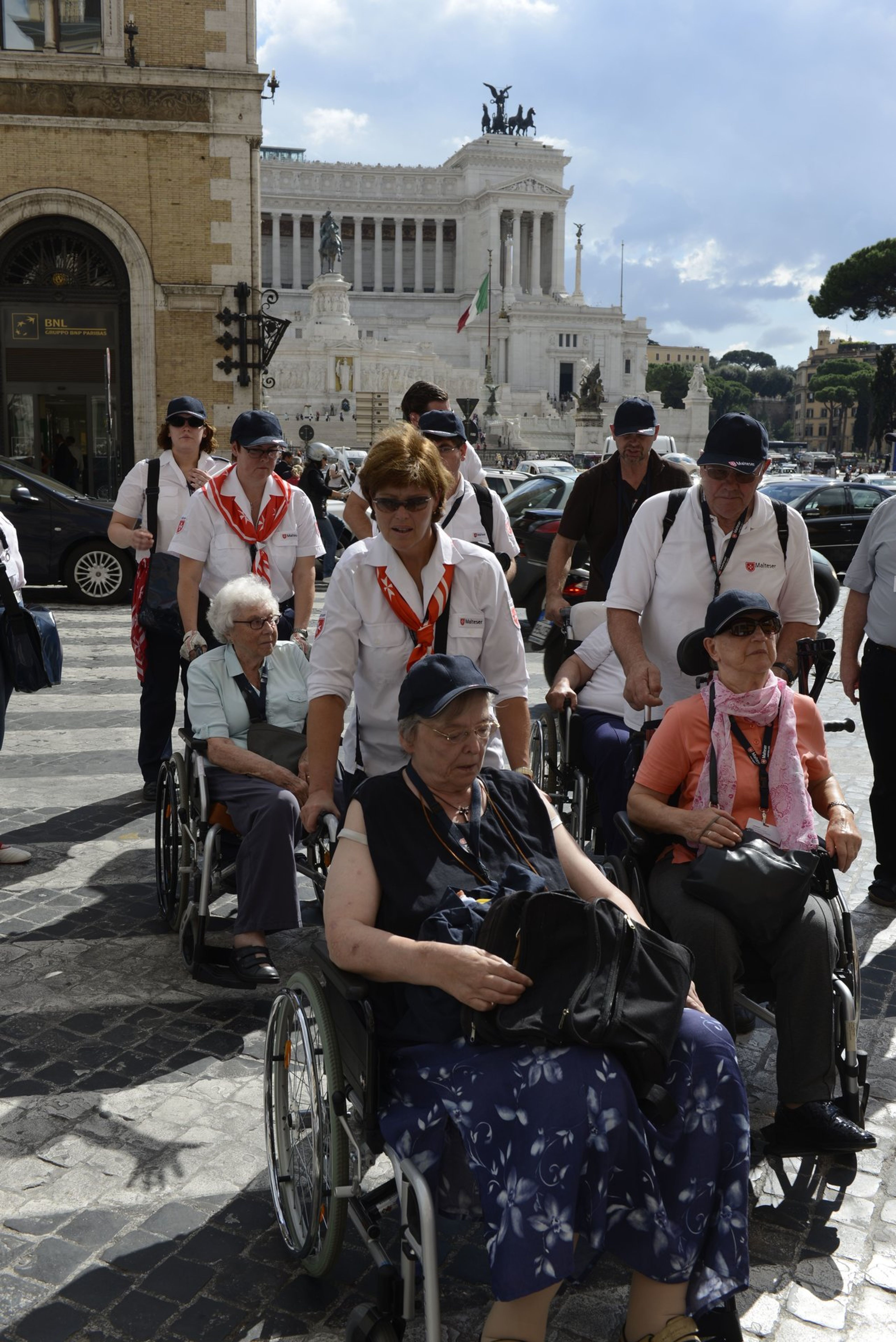 Geleitet von der römischen Motorradpolizei schwärmten die deutschen Pilger zu Fuß, mit Rollstuhl und Rollator zu den Sehenswürdigkeiten der Ewigen Stadt aus. Und wieder zeigte sich: So lebhaft und temperamentvoll es im römischen Verkehr sonst auch zugeht, wollte eine der Rolli-Gruppen über die Straße, wurden die heimischen Motorrad- und Autofahrer vorsichtig und rücksichtsvoll.