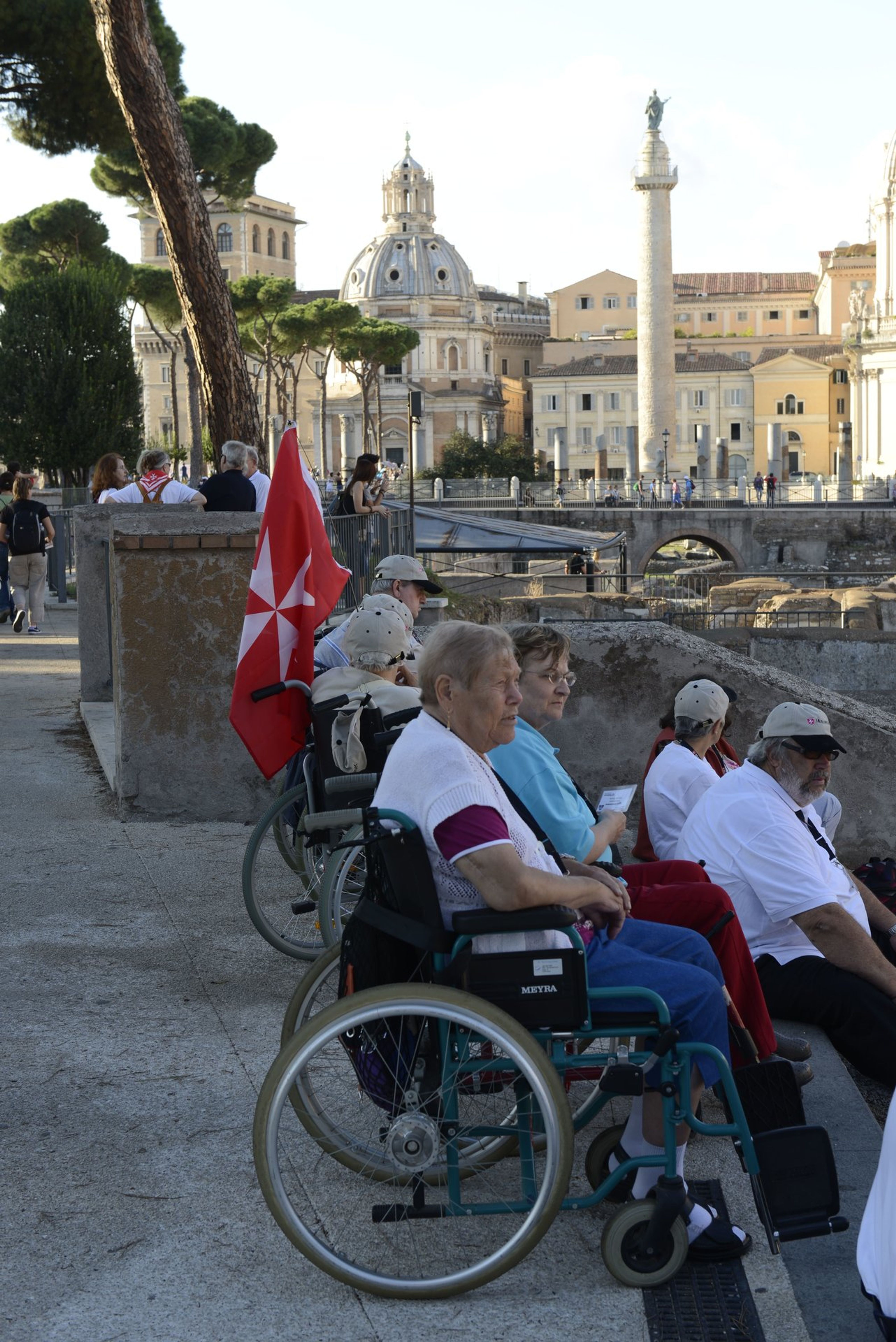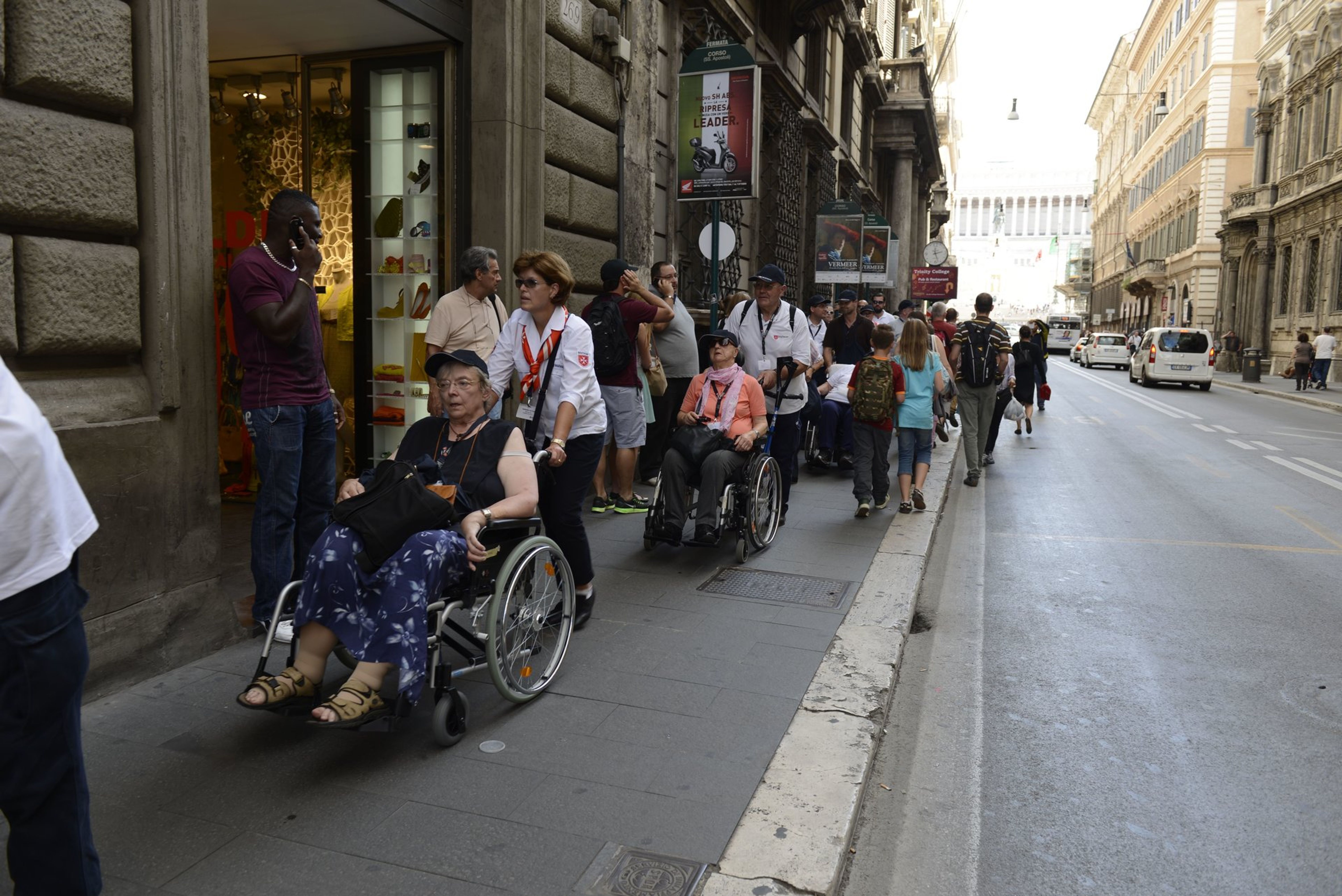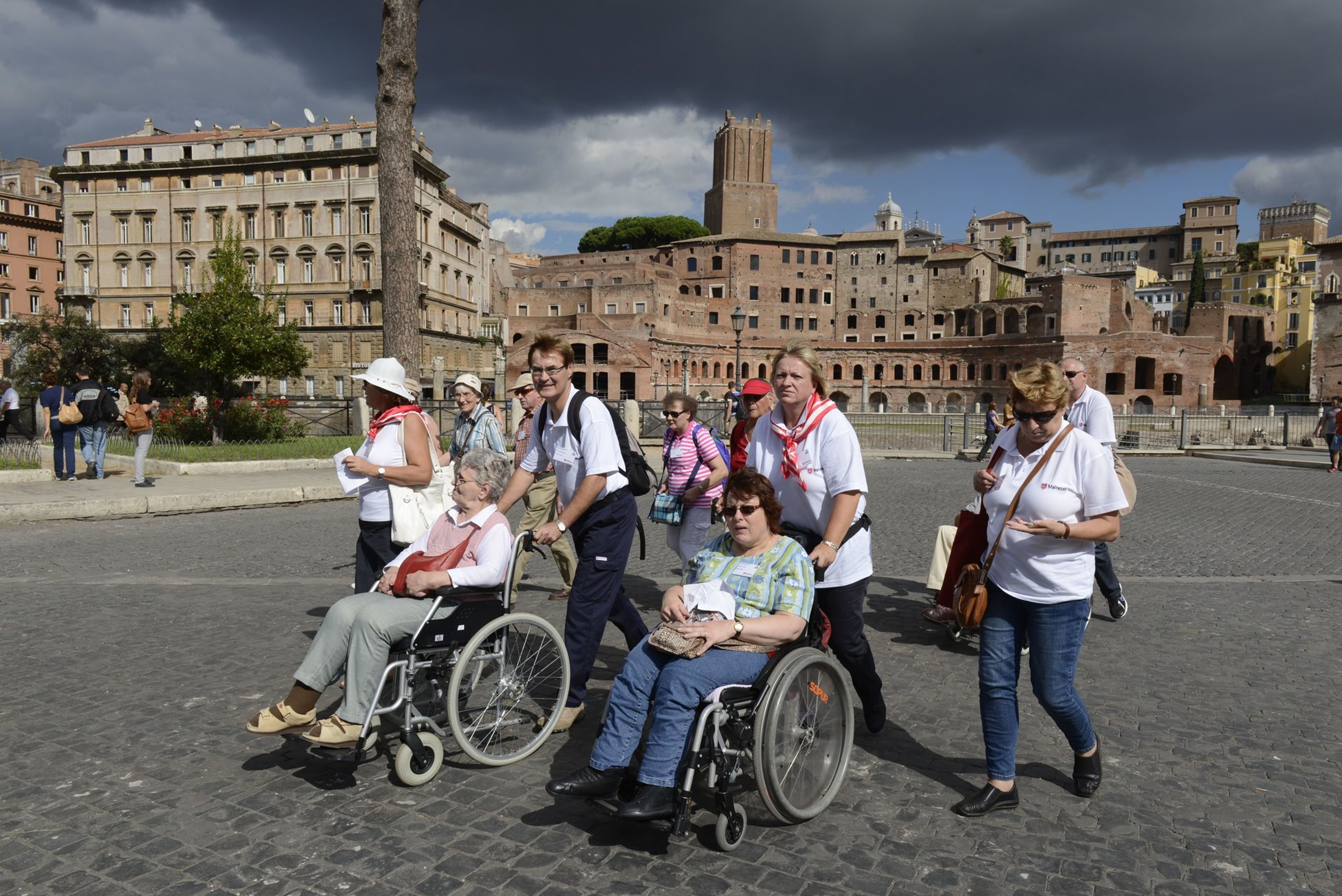 Geleitet von der römischen Motorradpolizei schwärmten die deutschen Pilger zu Fuß, mit Rollstuhl und Rollator zu den Sehenswürdigkeiten der Ewigen Stadt aus. Und wieder zeigte sich: So lebhaft und temperamentvoll es im römischen Verkehr sonst auch zugeht, wollte eine der Rolli-Gruppen über die Straße, wurden die heimischen Motorrad- und Autofahrer vorsichtig und rücksichtsvoll.
