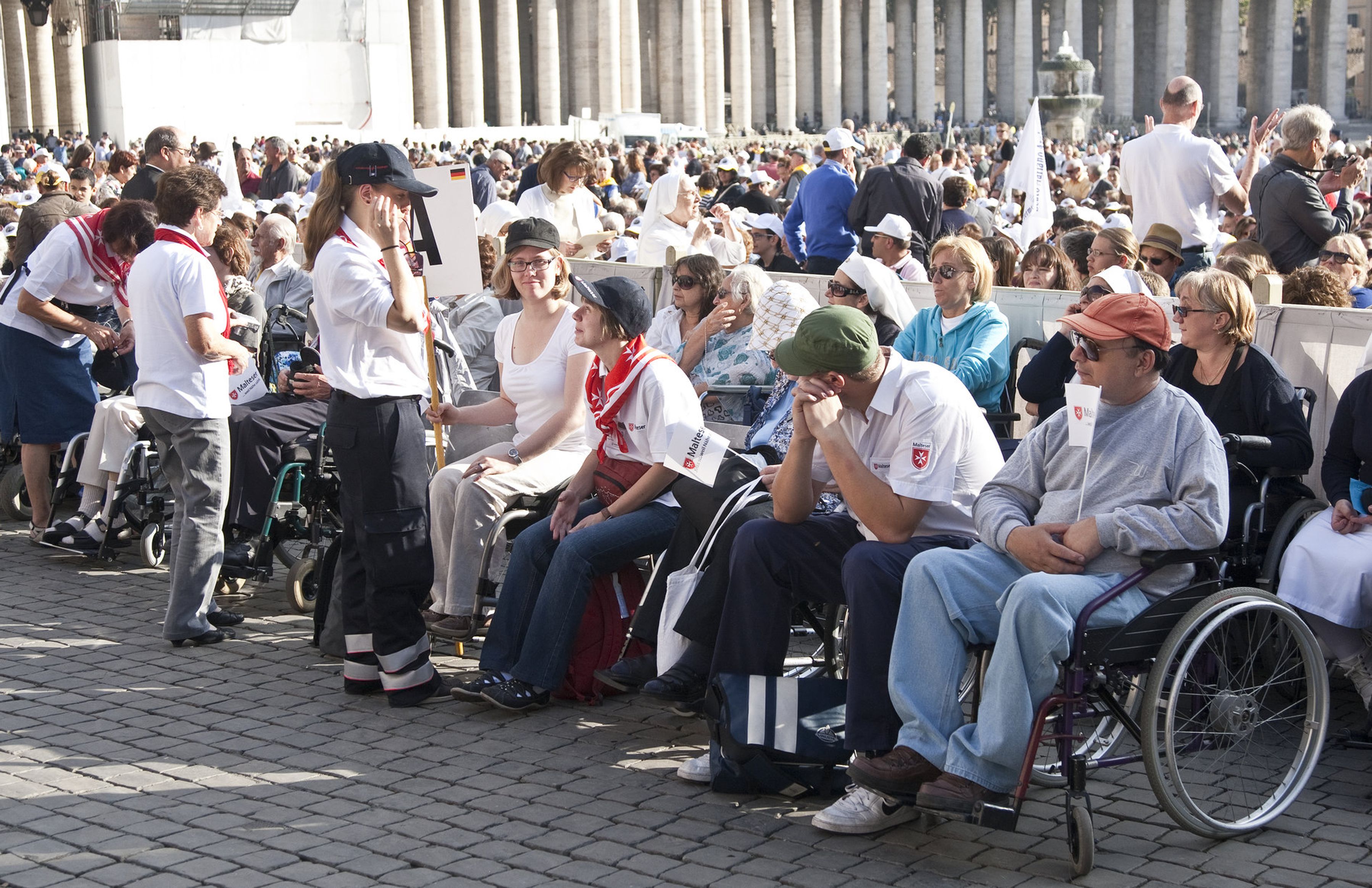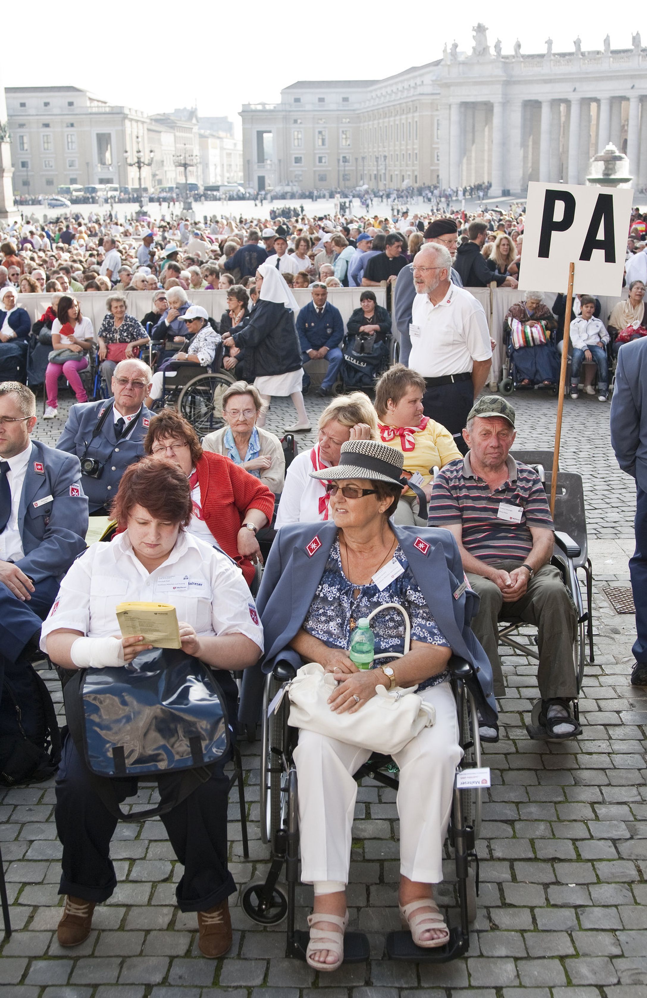 Nah am Papst - Der Höhepunkt der Wallfahrt für die meisten Pilger. Die kranken und behinderten Pilger saßen auf dem Petersplatz in der ersten Reihe, als Papst Benedikt durch die Reihe der vielen tausend Gläubigen fuhr und später sich in einem halben Dutzend Sprachen an die Gläubigen wandte.