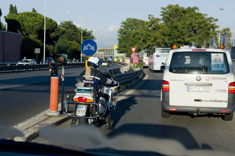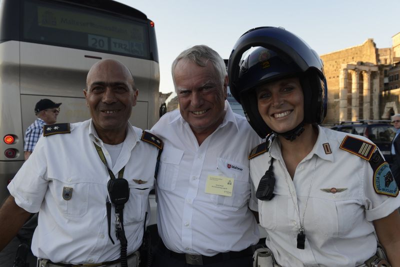 Was wäre die malteser Romwallfahrt ohne die römische Motorradpolizei? Einfach unvorstellbar! Die akrobatischen Fahrmanöver vor und neben den Buskonvois, die Verkehrslenkung mit Trillerpfeife und temperamentvollem Gestikulieren und nicht zuletzt die schmucken Uniformen gehören einfach zu dieser Wallfahrt dazu.