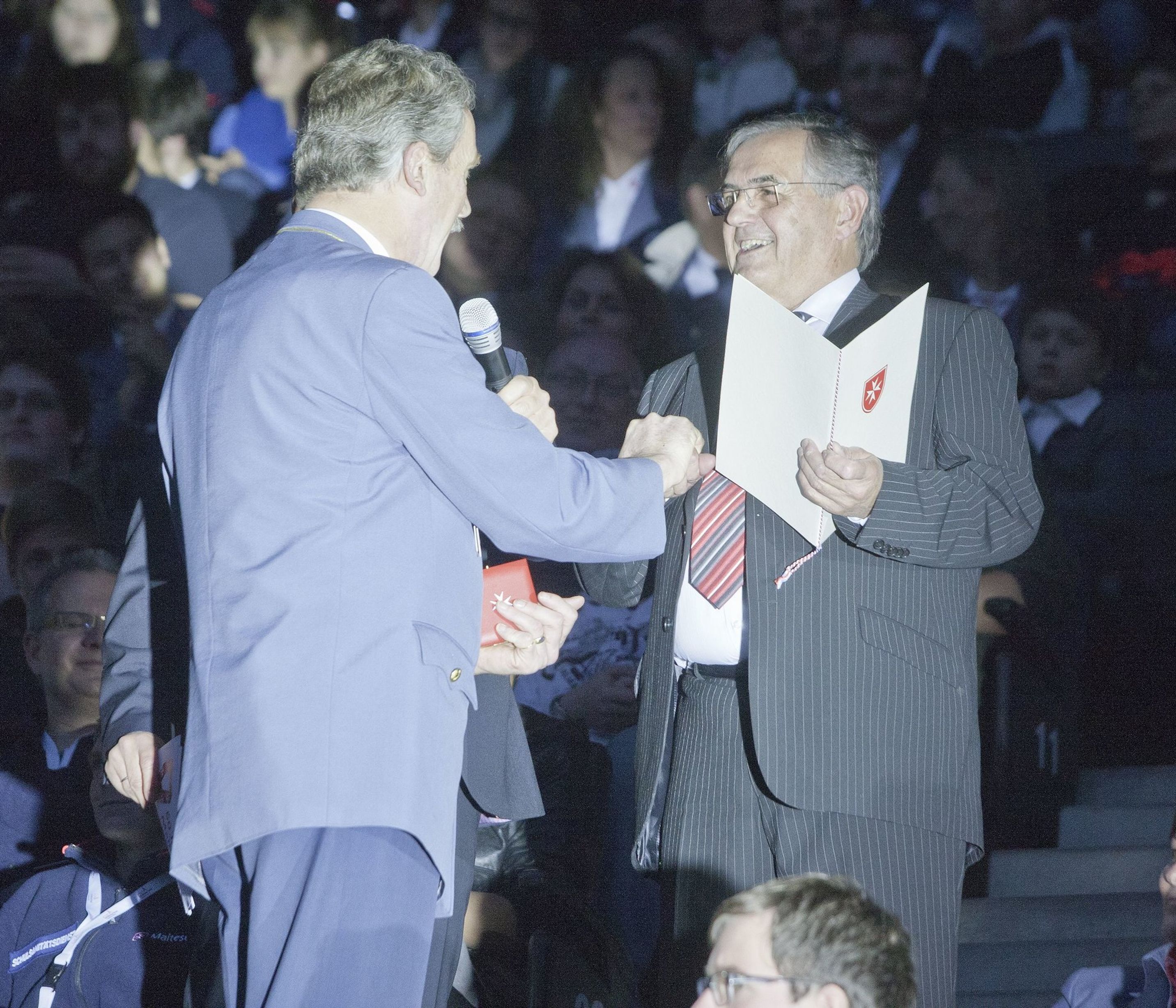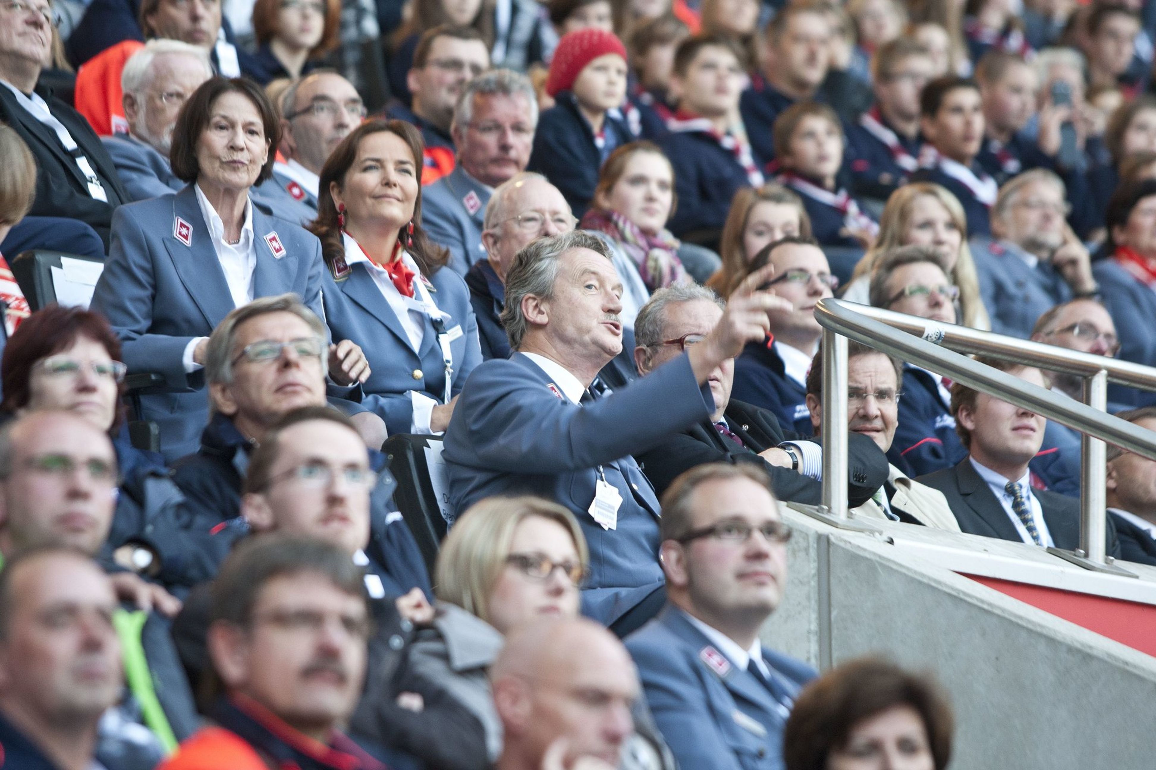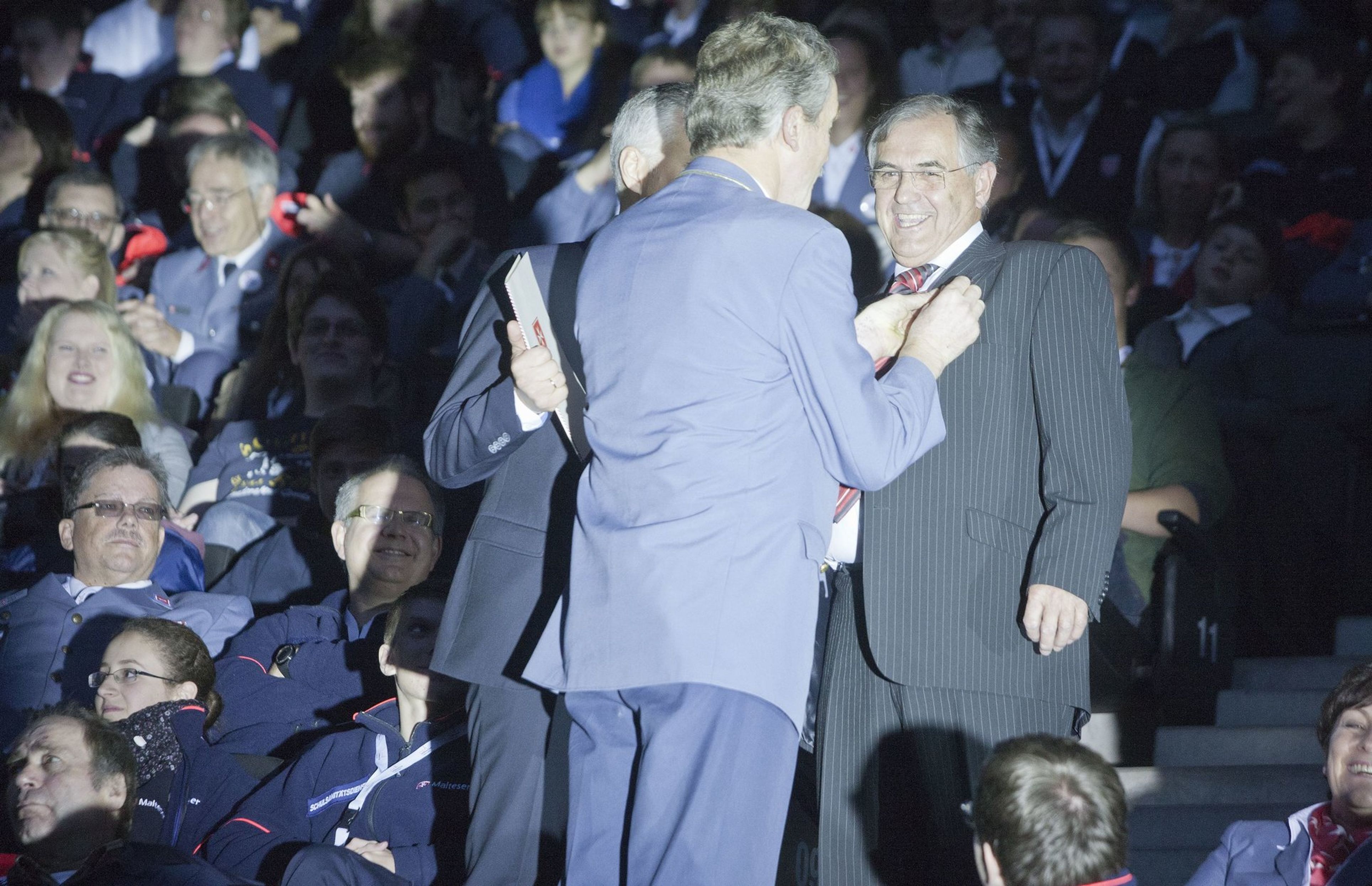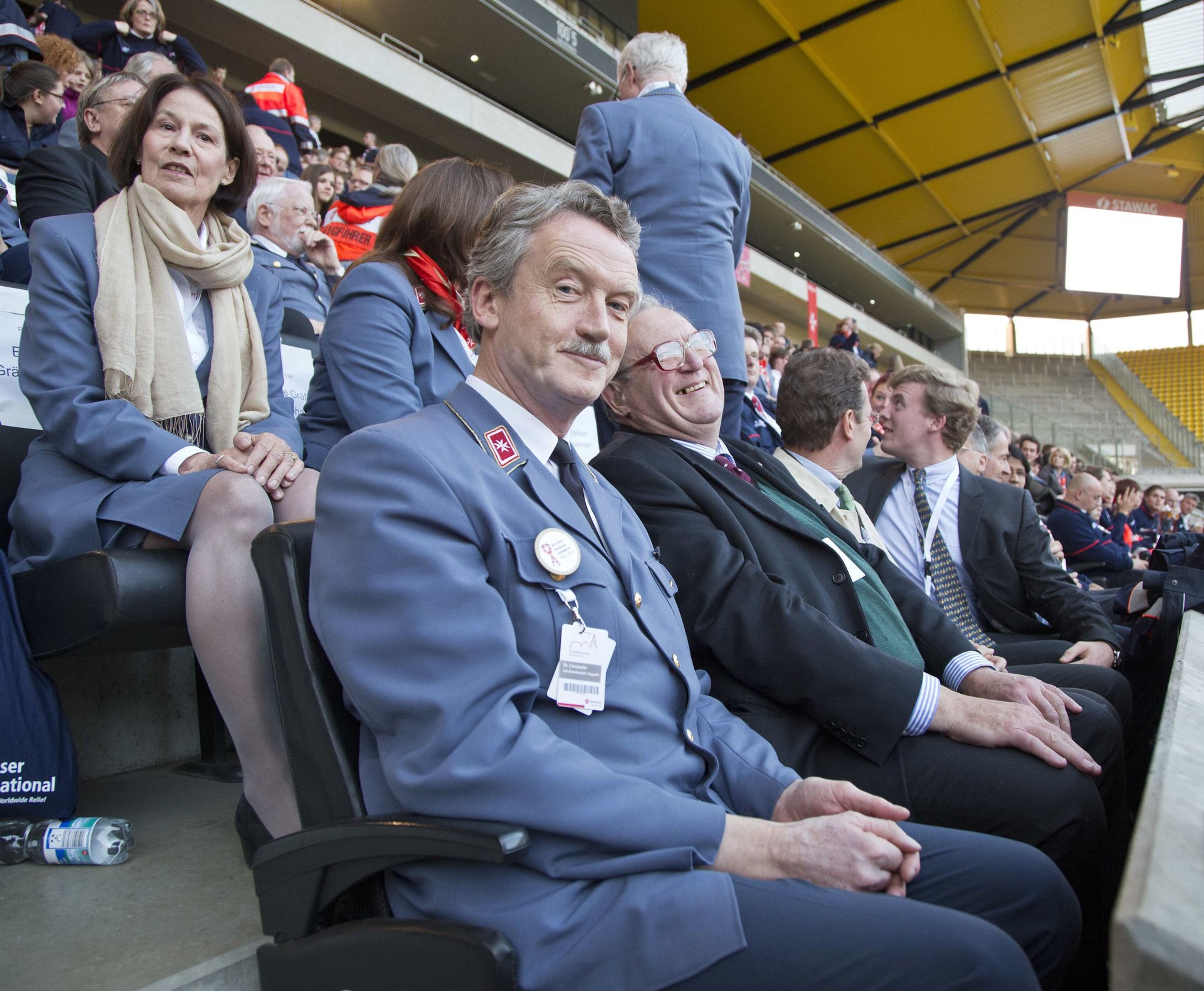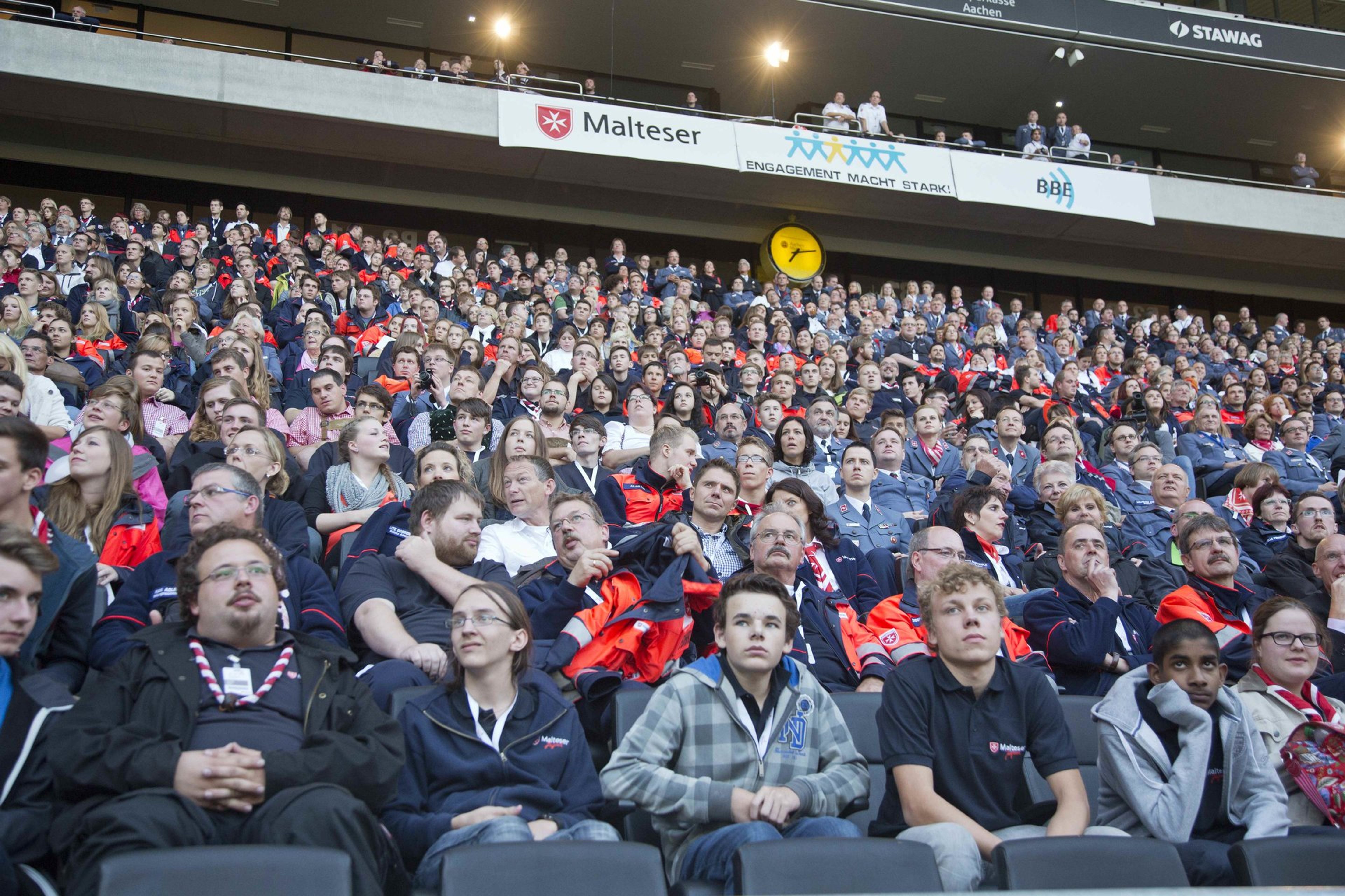 Einen besonderen Akzent der Feierlichkeiten setzte der stimmungsvolle Festabend mit einem Bühnenprogramm im Stadion - mit Charme und Emphase moderiert von Susan Link und Andreas von Thien - und einem festlichen Essen in der Business-Lounge. Mit persönlichen Video-Botschaften gratulierte neben Rainer Calmund von dem Lindenstraßen-Ensemble mit Marie-Luise Marjan auch die Bundeskanzlerin dem Malteser Hilfsdienst zum 60. Geburtstag.