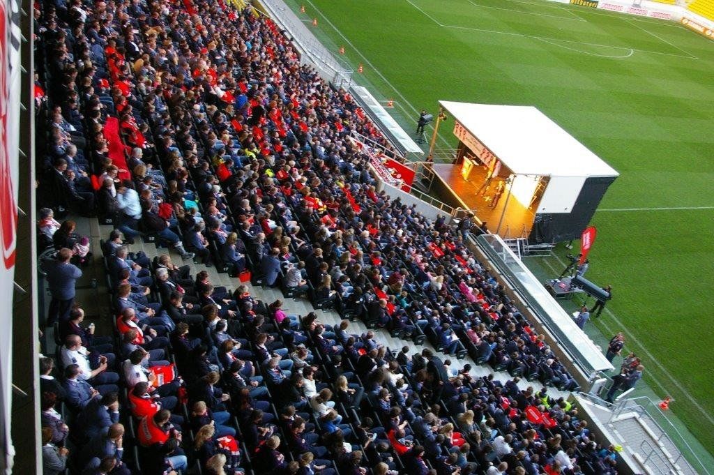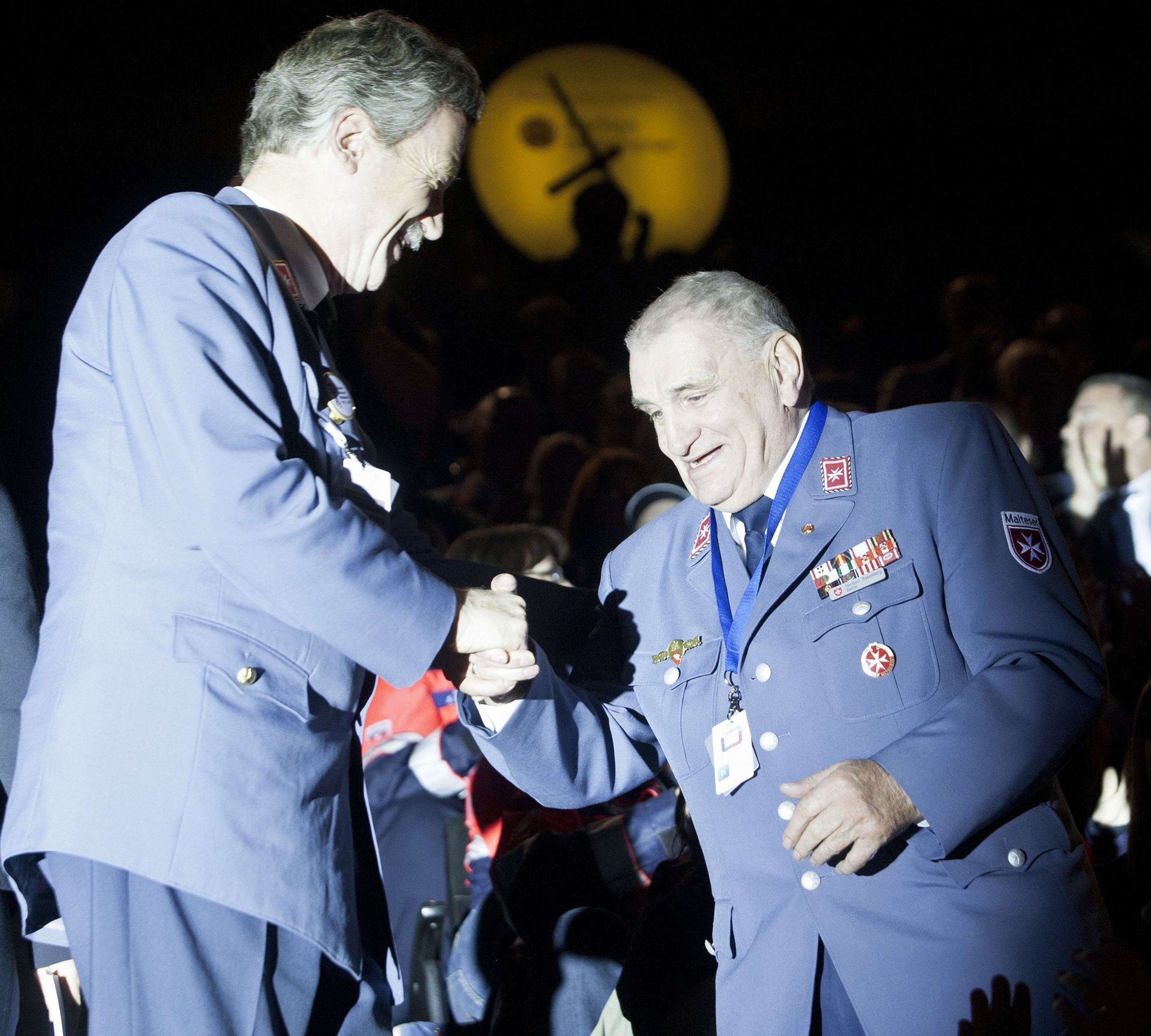 Einen besonderen Akzent der Feierlichkeiten setzte der stimmungsvolle Festabend mit einem Bühnenprogramm im Stadion - mit Charme und Emphase moderiert von Susan Link und Andreas von Thien - und einem festlichen Essen in der Business-Lounge. Mit persönlichen Video-Botschaften gratulierte neben Rainer Calmund von dem Lindenstraßen-Ensemble mit Marie-Luise Marjan auch die Bundeskanzlerin dem Malteser Hilfsdienst zum 60. Geburtstag.